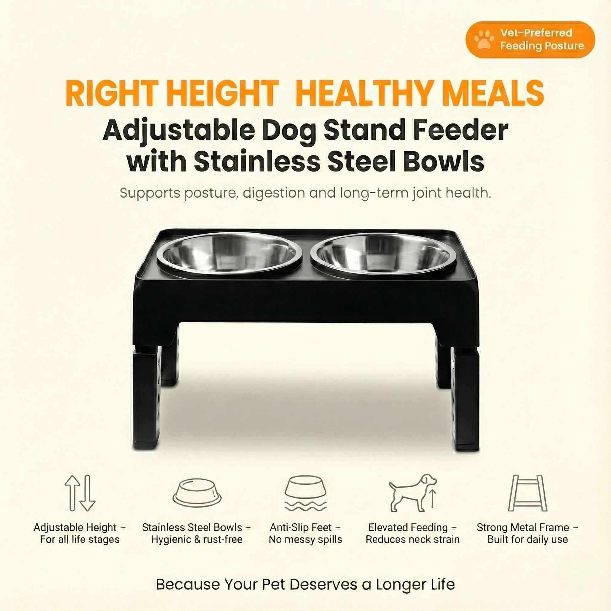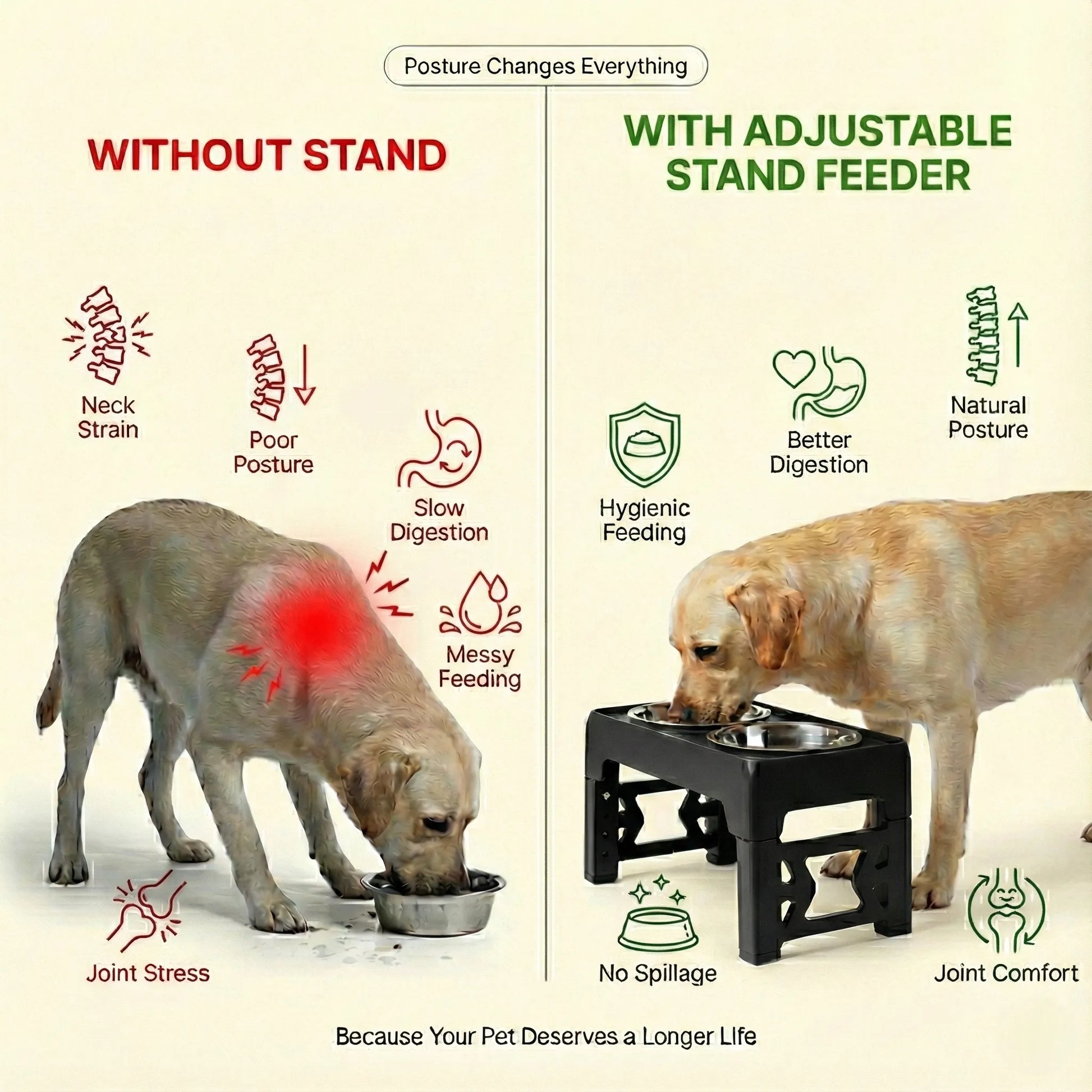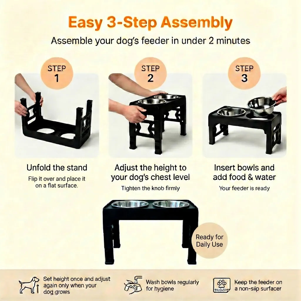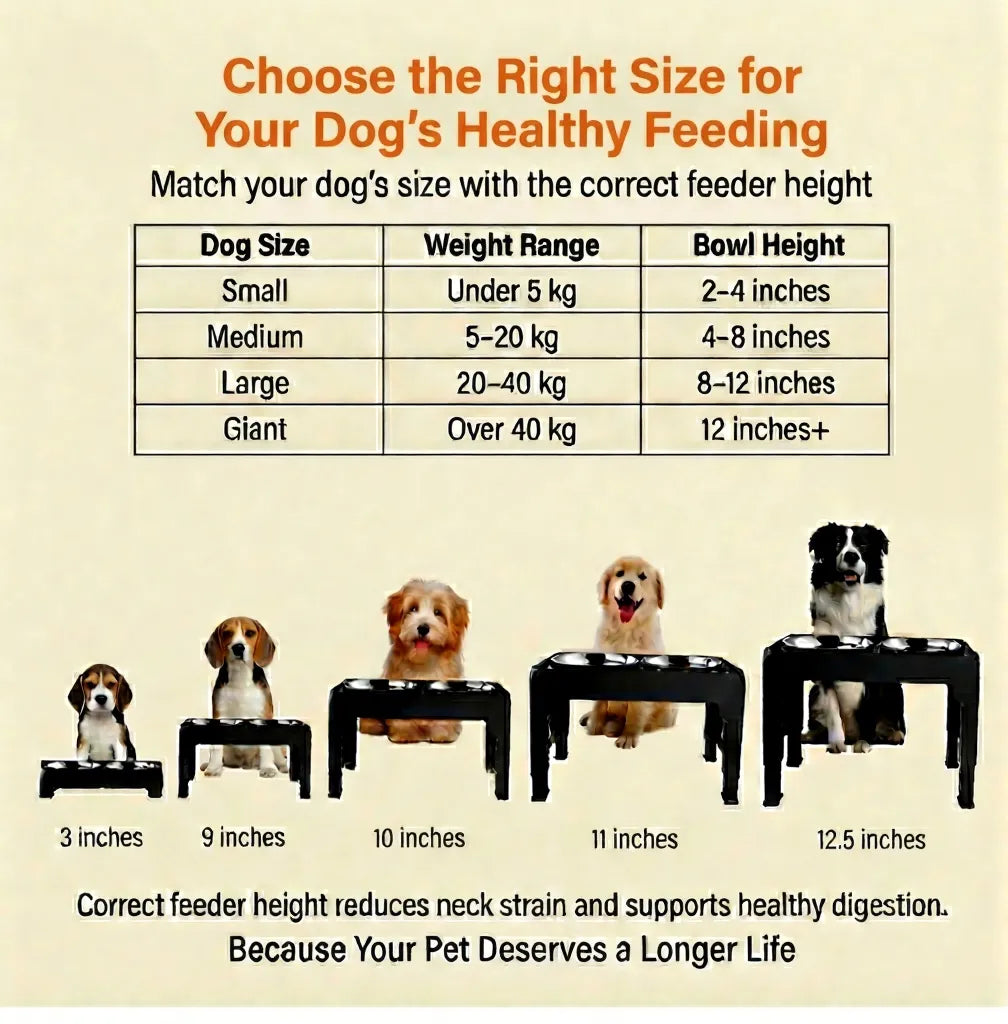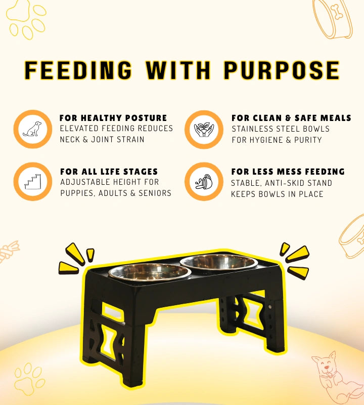 Adjustable Dog Stand Feeder Provide the ultimate comfort for your dog at every stage of its life. This adjustable elevated feeder is the perfect all-in-one solution for growing puppies, adult dogs, and senior companions. By raising the food and water bowls to a comfortable height, you can help improve your dog's posture, reduce strain on their neck and joints, and promote healthier digestion.